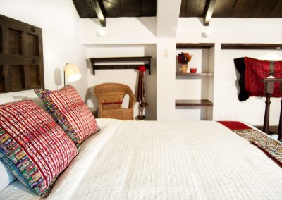 The villas boast a charming design, blending rustic wooden beams and exposed dark wood accents with bright white walls and colorful, locally-inspired textiles. Each space, from the cozy living rooms to the spacious bedrooms, is thoughtfully decorated with traditional art and craftsmanship, creating a welcoming and authentic atmosphere.