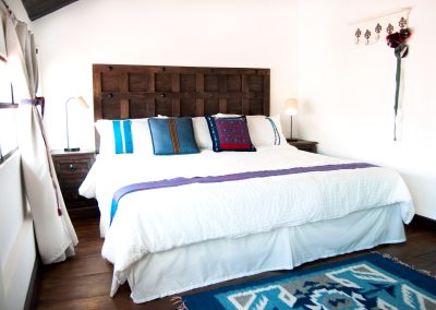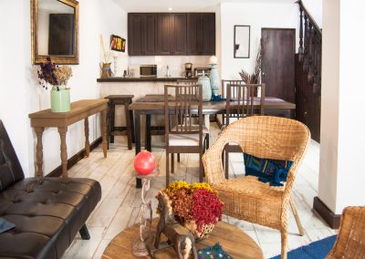 The villas boast a charming design, blending rustic wooden beams and exposed dark wood accents with bright white walls and colorful, locally-inspired textiles. Each space, from the cozy living rooms to the spacious bedrooms, is thoughtfully decorated with traditional art and craftsmanship, creating a welcoming and authentic atmosphere.