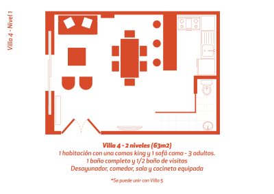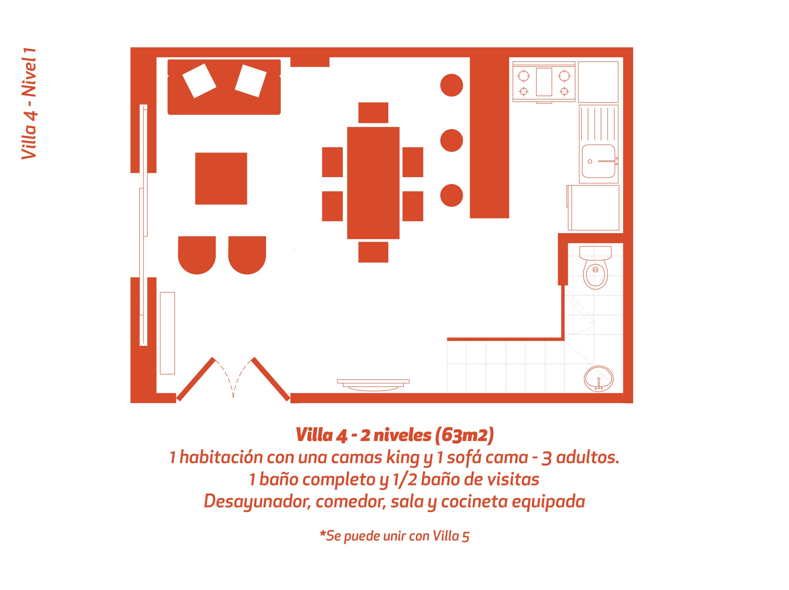 2 stories couples Villa, with 1 large Bedroom with a double bed, lounge, dining room, kitchen an 1.5 bathrooms.